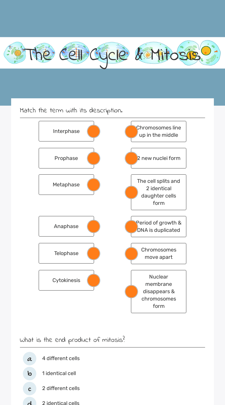 What are the four phases of mitosis? Name the 2 main phases of the cell cycle. What moves the chromatids during mitosis? During what phase of mitosis do centromeres divide and the chromosomes move toward their . Cell division worksheet mitosis and meiosis demonstration (you will use this worksheet to track your attempts to model the cell cycle. Match the term to the description a prophane d. The nucleolus begins to fade from view. Mitosis worksheet & diagram identification. More fromfamily 2 family learning resources. What phase are daughter cells in as a result of mitosis? The amount of activity in a cell is related to its volume. End of this phase 2 sister chromatids. Consists of g1, s and g2 phases in the cell cycle.